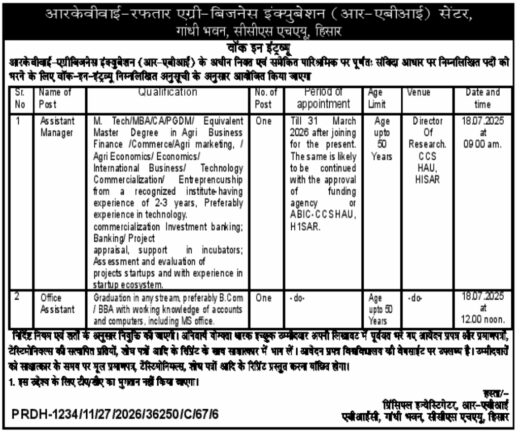 आरकेवीवाई-रफ़्तार एग्री-बिजनेस इनक्यूबेशन (आर-एबीआई) सेंटर, गांधी भवन, सीसीएस एचएयू, हिसार, हरियाणा आपको सूचित करता है कि आरकेवीवाई-एग्रीबिजनेस इनक्यूबेटर (आर-एबीआई) के तहत सहायक प्रबंधक और कार्यालय सहायक के पद के लिए आवेदन