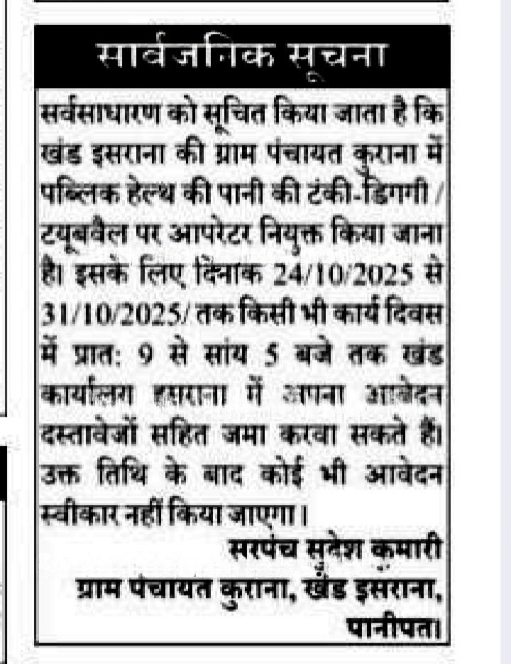 | Gram Panchayat Kurana, Block Israna, Panipat | Read Official Notice |
