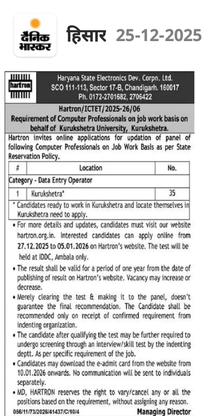 Haryana HARTRON DEO Recruitment 2025-26 : Here You Can Get All The Current And Upcoming Information Related To Haryana HARTRON DEO Vacancy 2025. Like Recruitment News, HARTRON DEO Vacancy 2025 Total Posts, Important Dates, Application Fees, Qualification, Age Limit, HARTRON DEO Vacancy 2025 Selection Process, Salary, Syllabus, Exam Pattern, Exam Date, Admit Card, Answer Key, Merit List, HARTRON DEO Vacancy 2025 Result, Question Paper Etc.