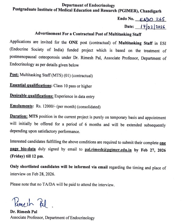 Chandigarh PGI Vacancy 2026 :- Postgraduate Institute of Medical Education and Research Chandigarh issue Applications are invited for the post of Multi Tasking Staff posts. Interested Candidate can apply through Email. All details related to Chandigarh PGI Vacancy 2026 are given below in this post.