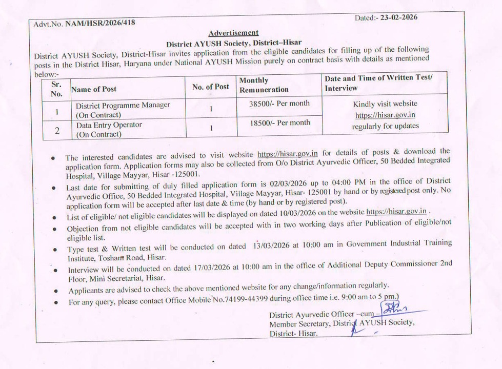 | District Ayush Society Hisar Vacancy 2026 Notice | Official Notice |