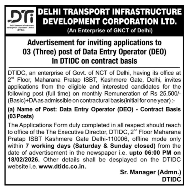 DTIDC Vacancy 2026 : The Delhi Transport Infrastructure Development Corporation (DTIDC) issued the latest notification for the post of Data Entry Operator. Interested Candidate can apply through Sending/ Submitting their application form via By Post or By Hand. All details related to DTIDC Recruitment 2026 are given below in this post.