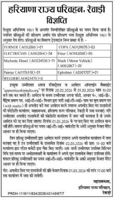 The Ministry of Skill Development and Entrepreneurship has released a notification inviting applications for various apprentice posts at Rewari Bus Depot under Rewari Roadways.